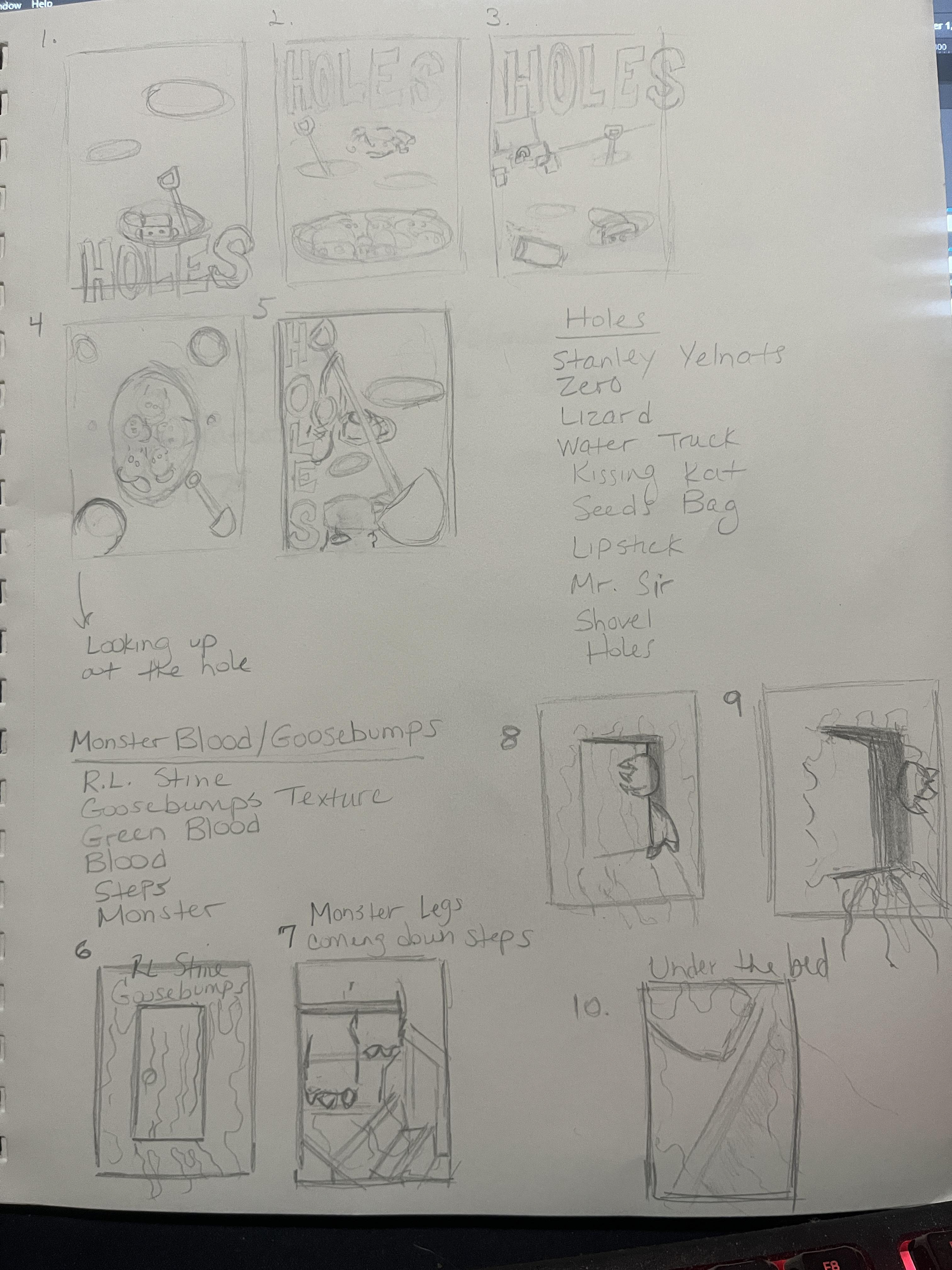 This assignment was centered around recreating covers for books that had an impact on my life when I was young. The two books I shared were Holes by Louis Sachar and a Goosebumps book called “Monster Blood”’ by R.L. Stein. I was amped about this assignment. I remember how wild my imagination would be reading books and how it continues. The idea that a kid could be influenced by a cover I created could influence them to get into art and continue reading. Early on in the thumbnail stage, I was so set on recreating what was already there but then I relied on showcasing easter eggs to highlight important aspects of the book.